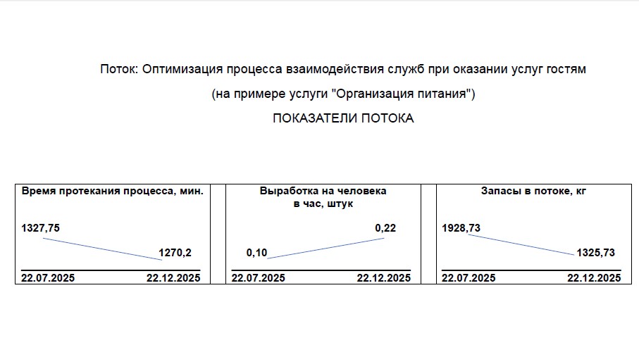 Совместно с экспертами Регионального центра компетенций команда санатория проанализировала и оптимизировала всю цепочку взаимодействия служб - от продуктового склада до окончания рациона. Благодаря предложенным мерам нам удалось сократить время обслуживания, устранить выявленные потери и рационально распределить усилия сотрудников.